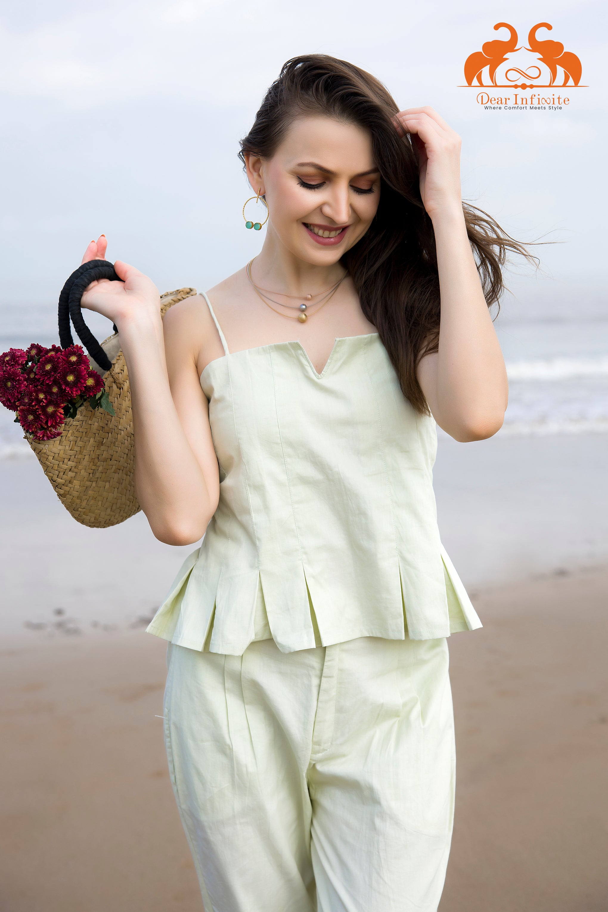 This two-piece set features a softly structured strap top with pleated detailing paired with matching straight-fit pants. Crafted from 100% pure cotton in a breathable poplin weave, the soft mint hue brings a calm, contemporary energy that’s ideal for vacations, city days, or breezy brunches.